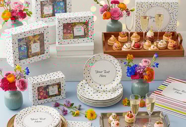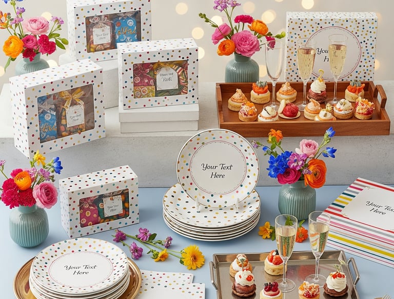 We offer customizable designer boxes, plates, trays, and flowers for various occasions.
